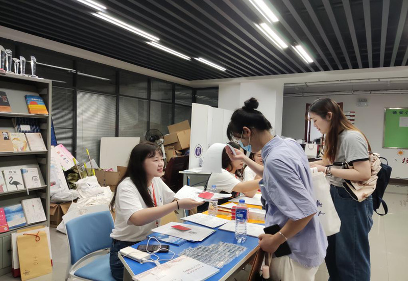 上午七点,志愿者穿着统一服装在清凉的晨风中到达集合地点。男生志愿者在一食堂前的广场上搭起帐篷,准备签到表和小推车;女生志愿者在科教楼B座16楼大厅搭好桌子,准备新生报道材料和物资。随着新生的陆续到来,志愿者们井然有序地忙碌起来,核对新生信息,帮助新生搬运行李;分发《研究生手册》、校园卡、防疫爱心包等入学材料与防疫物资。新生纷纷表示,华体会足球的迎新工作充满爱心、让人舒心,十分暖心!